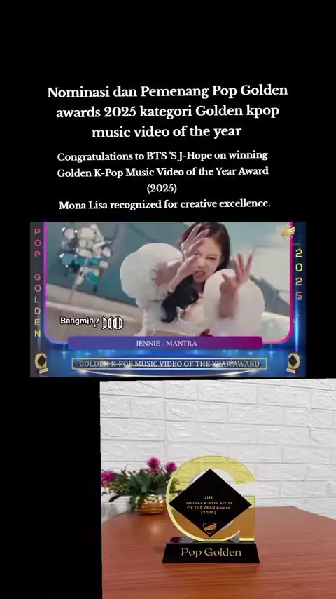 Congratulations to @BTS 'S J-Hope on winning Golden K-Pop Music Video of the Year Award (2025) Mona Lisa recognized for creative excellence. #PopGoldenAwards2025 #JHOPE #ot7bts #btsinfo #btsarmy