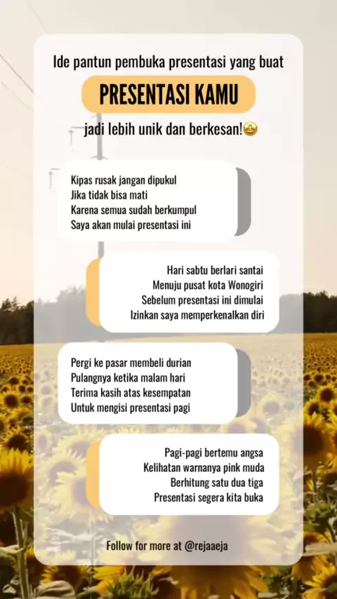 pantun ini buat pembukaan presentasi kamu makin menarik dan unik😉 follow untuk tips menarik lainnya😃✨ #publikspeaking #komunikasi #publikspeakingtraining #publikspeakingindonesia #pantunpembuka #pantunpresentasi #tipspublicspeaking #presentasi #pembukapresentasi #presentasiyangbaik #tipspresentasi #kontenkreator #edukasi # #