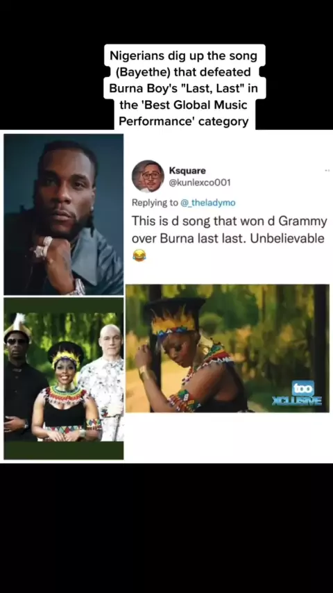 Nigerians dig up the song (Bayethe) that defeated Burna Boy's "Last, Last" in the 'Best Global Music Performance' category#afrobeats