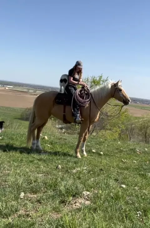 Os cães-vaca sabem como carregar. Cassie precisa de uma ajudinha, mas galo é tudo lúpulo # rancho # rancholife # cowdogs # horse # palomino # totinos425