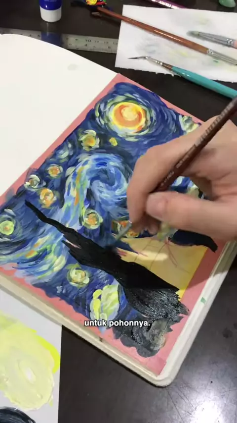 long time no tutor^^ #karyaseniku #acrylicpainting #starrynight #vangogh #vangoghexhibition #sketchbookart #paintingtutorial #tutorialmelukis #weknowlah #tutorial #