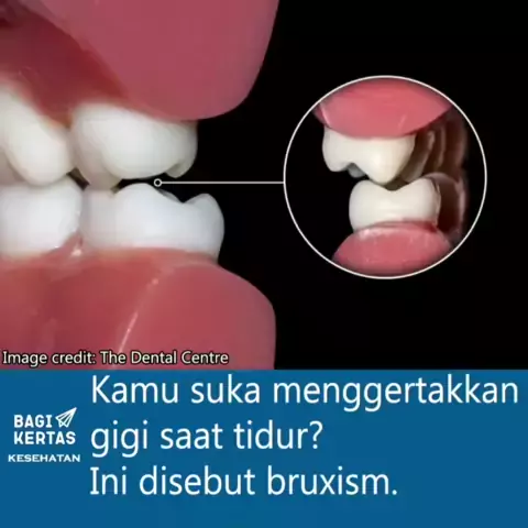 Bruxism adalah kebiasaan menggertakkan atau mengatupkan gigi, sering kali tanpa disadari, terutama saat tidur. Hingga saat ini belum diketahui secara pasti penyebab dari gangguan bruxism. Namun, dinilai ada kombinasi antara gangguan pada fisik, psikologis, hingga genetik. Bruxism dapat terjadi karena stres, kecemasan, gangguan tidur, atau posisi gigi yang tidak normal. Kebiasaan ini dapat menyebabkan nyeri rahang, kerusakan gigi, hingga sakit kepala. Video by Medical Art Official (YT)