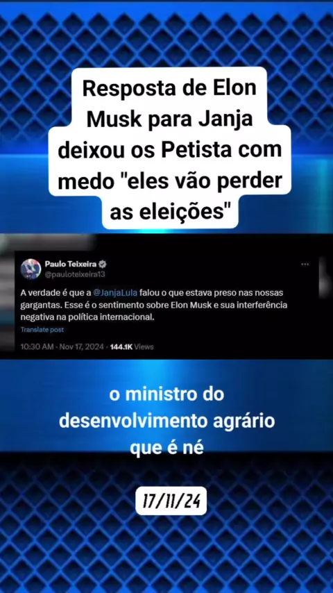 Resposta de Elon Musk para Janja deixou os petistas com medo "eles vão perder as eleições". 17/11/24 #noticias #politica