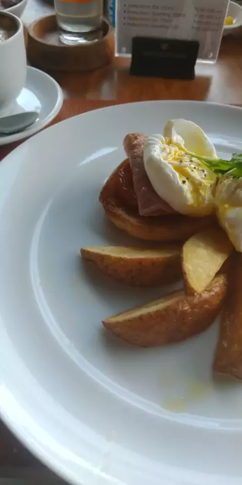 egg benedict . rasanya ini enak banget guys sausnya nyatu sama kuning telurnya terus meleleh ke kentang dan roti nya bikin menu ini jadi makin nikmat guys #food #makanan #makananenak