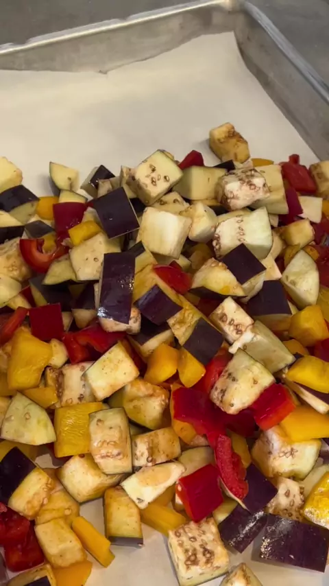 Como acompanhamento ou entradinha, essa berinjela com pimentão no forno fica incrível. ▫️Ingredientes - 2 berinjelas - 1 pimentão vermelho - 1 pimentão amarelo - 4 dentes de alho - Páprica defumada - Pimenta chili - Sal - Azeite • levei ao forno por 30 minutos a 200°C #receitas #receitasimples #receitasaudavel #receitafit