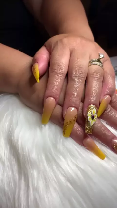 #yellow #yellownails #yellowacrylicnails #longnails #acrylicnails #nails #glitter #glitternails #3dflowers #3dflowernails #3dnailart #difuminado