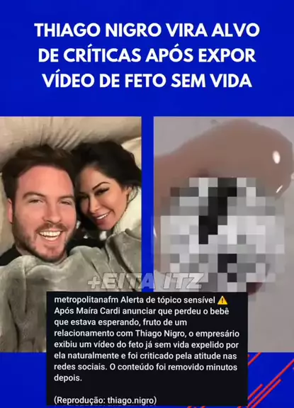 Thiago Nigro publica imagens de feto perdido por Maíra Cardi Empresário e influenciador da área de finanças publicou vídeo que mostra o feto O expelidoempresário e influenciador digital Thiago Nigro, conhecido como Primo Rico, exibiu nas redes sociais o feto perdido pela esposa, a também influenciadora Maíra Cardi. Conforme relatado por ele, o embrião foi expelido na madrugada deste sábado (4 de janeiro) #ThiagoNigro #primoricofeto #abortoprimorico #mulherdeprimorico #esposathiagonigro