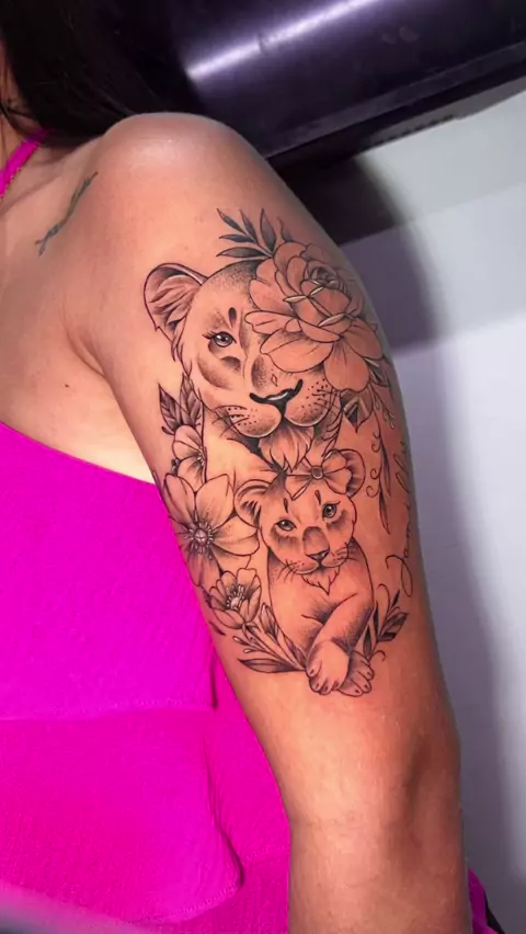 tatuagem de leoa com filhote pode simbolizar a força da mãe, a união familiar e a proteção. A leoa é um símbolo de poder feminino, coragem e garra.