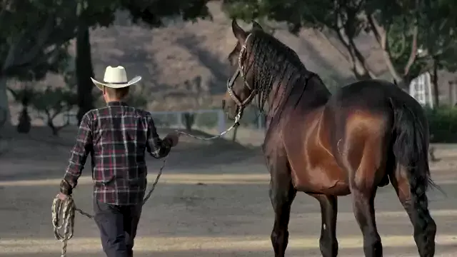Um fazendeiro e seu cavalo Homem barbudo um chapéu de cowboy, camisa xadrez de manga comprida e calça jeans azul e um cavalo marrom com cavalo de crina preta através de um rancho. #animais #kwai