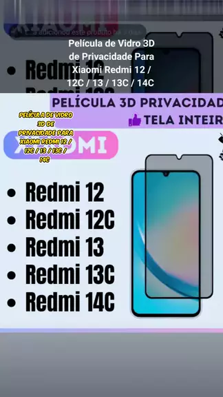Película de Vidro 3D de Privacidade Para Xiaomi Redmi 12 / 12C / 13 / 13C / 14C