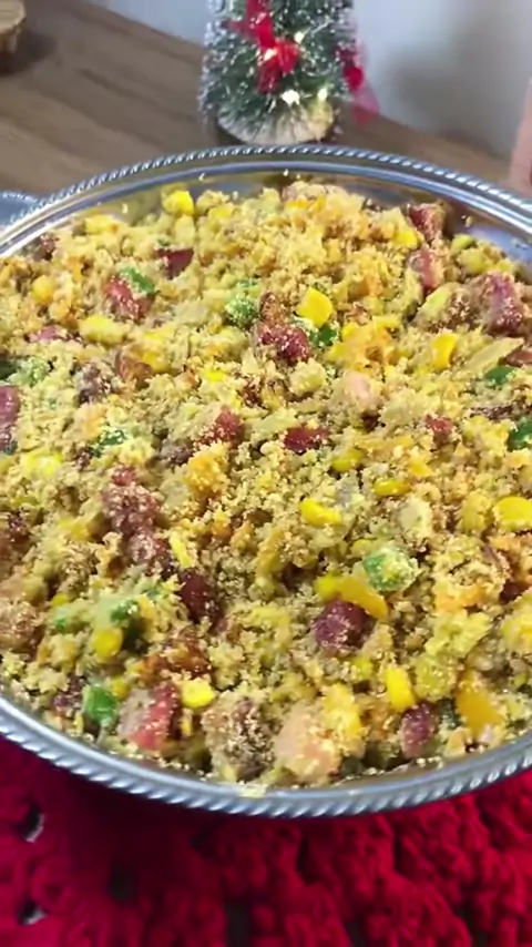 Farofa - receita abaixo ⬇️ 1 pimentão verde 1 pimentão amarelo 1/2 cebola 1 lata de milho 1 calabresa 100gr de bacon 1 cenoura Farinha de mandioca 2 ovos Farofa pra sua ceia de Natal Fácil e deliciosa #natal #merrychristmas #receitas #receitadenatal