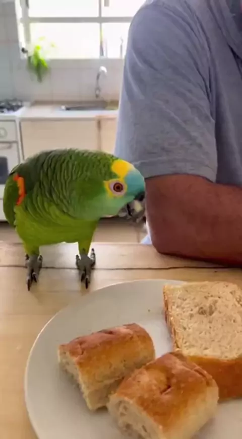 Papagaio disse que o pão tá duro e que ele quer um novo com manteiga kkk #papagaio #papgaioengracado #papagaiofalando
