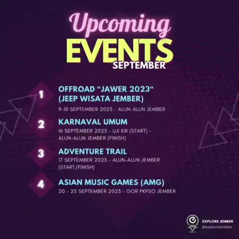CATAT TANGGALNYA!! . Inilah jadwal event yang akan digelar September 2023 Jangan lupa ya rek.. tetap jaga kebersihan dengan membuang sampah pada tempatnya atau bawa pulang sampahmu π Jika informasi ini bermanfaat, jangan lupa untuk save dan share ya.. #explorejember #jember # #jatim #jemberkueren #beritajember #explorejawatimuran