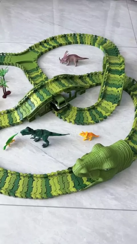 Um grande conjunto de vagões de trem de emenda de dinossauro é tão econômico que os bebês não podem resistir, uma grande caixa de presente, um pacote poser e um brinquedo de pessoa com macarrão