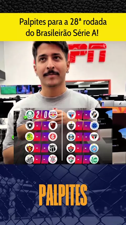 Palpites pros jogos da 28ª rodada do brasileirão: Palmeiras x Bragantino, Botafogo x Flamengo, Santos x Corinthians, Atlético MG x Cruzeiro, Grêmio x São Paulo, Fluminense x Juventude, Vitória x Bahia!! #Palmeirasxbragantino #BotafogoXFlamengo #santosxcorinthians #brasileirão2025 #esporteviral