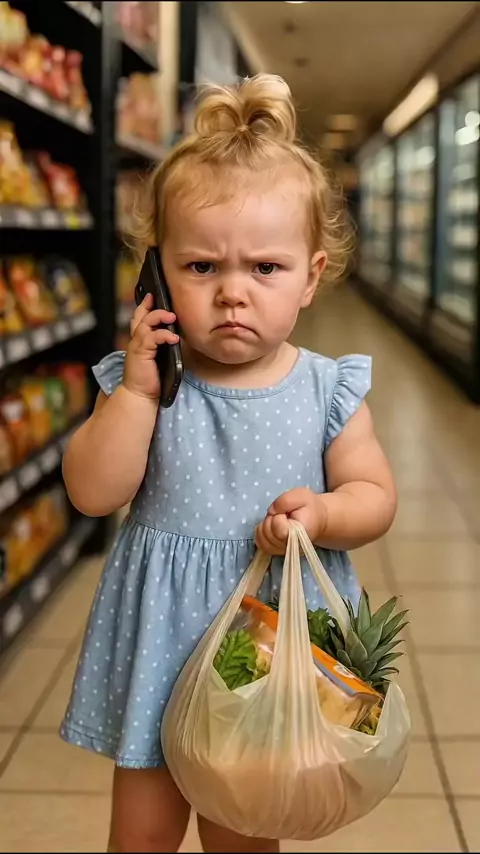 Angry Baby on the Phone with Mom 😂📞 | Cutest Grocery Moment Ever! This tiny shopper is absolutely done with mom’s grocery list! With her serious face, cute little dress, and a full shopping bag, she’s the most adorable boss in the supermarket. AI meets pure sass and sweetness! . #ai #aiart #aiartwork #digitalart #midjourney