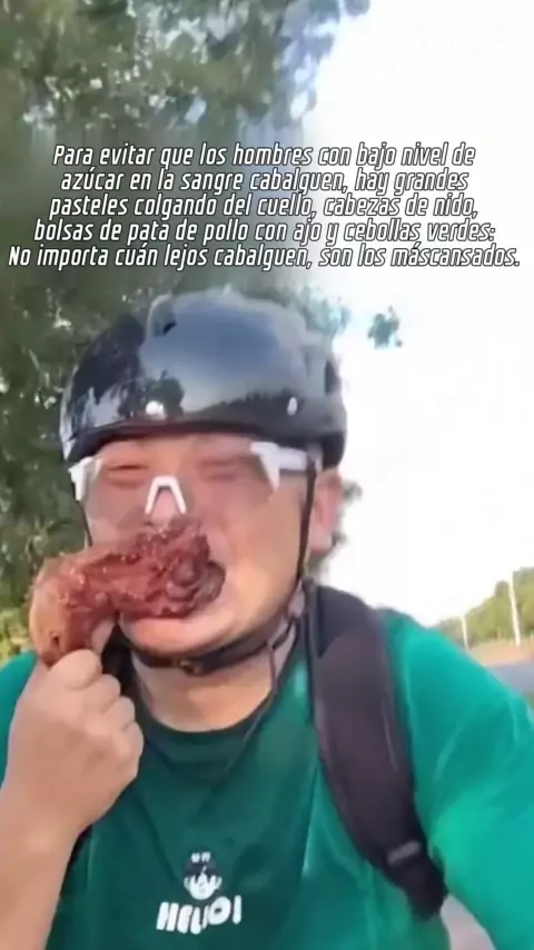 Y con el fin de prevenir el bajo nivel de azúcar en la sangre, el hombre realizó una comida de lujo cuando montaba. Colgó un gran pastel, una cabeza de nido, una gran pata de pollo alrededor de su cuello, y había ajo y cebollas verdes en la bolsa.