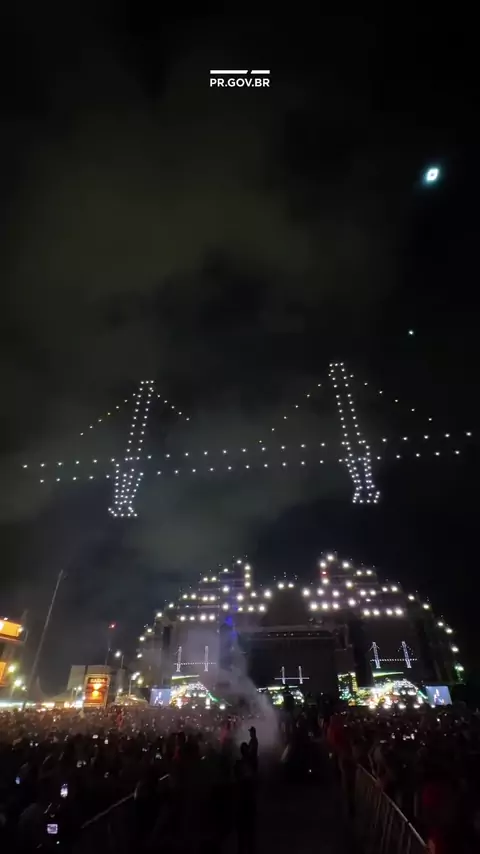 No céu de Matinhos, uma imagem que emocionou ✨🚁 Os drones do show do Alok desenharam a Ponte de Guaratuba nas alturas. Um espetáculo ✨