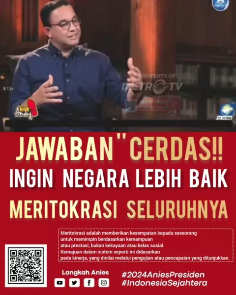 Jawaban negarawan sejati yg mementingkan kebaikan negara dan rakyat serta birokrasi. Negara jadi lebih baik Lakukan MERITOKRASI SELURUHNYA Insyaallah tercapai demokrasi yg baik, kesejahteraan tercapai, cita cita pendiri bangsa terlaksana. @aniesbaswedan 2024 Presiden Cerdas. Meritokrasi adalah sistem memberikan kesempatan kepada seseorang untuk memimpin berdasarkan kemampuan atau prestasi, bukan kekayaan atau kelas sosial. Kemajuan dalam sistem seperti ini didasarkan pada kinerja, #caracepatkaya