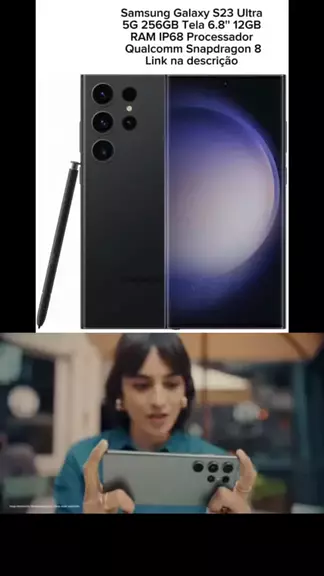 Samsung Galaxy S23 Ultra 5G 256GB Tela 6.8'' 12GB RAM IP68 Processador Qualcomm Snapdragon 8 link https://amzn.to/3ZOQWlx Galaxy Al i. chegou Bem-vindo à era da Al no celular. Com o Galaxy S23 Ultra nas suas mãos, desperte novos níveis de criatividade, produtividade e possibilidades, começando pelo dispositivo mais importante da sua vida. O seu smartphone. Extraordinariamente equipado Nós reunimos o maior sensor, pixels de absorção de luz e tecnologia de estabilização de vídeo do Galaxy em um