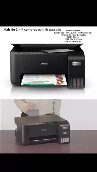 Marca: EPSON Epson EcoTank L3250 - Multifuncional, Tanque de Tinta Colorida, Wi-Fi Direct, USB, Bivolt, Preto link https://amzn.to/4aM2Gul Multifuncional EcoTank L3250 Imprime | Copia | Digitaliza | Wireless Baixo custo de impressão: imprime até 4.500 páginas em preto ou 7.500 páginas coloridas com um kit de garrafas de tinta de reposição originais Epson. Confiabilidade e performance incomparáveis: a tecnologia MicroPiezo Heat-Free da Epson garante longa vida ao equipamento, além de impressõe