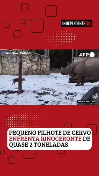 🦌 🦏 Pum pequeno filhote de cervo de 13 kg enfrentou um rinoceronte de 1,7 tonelada no zoológico de Wroclaw, Polônia. O vídeo encantou a web. Vídeo: AFP #news #noticias #diversao