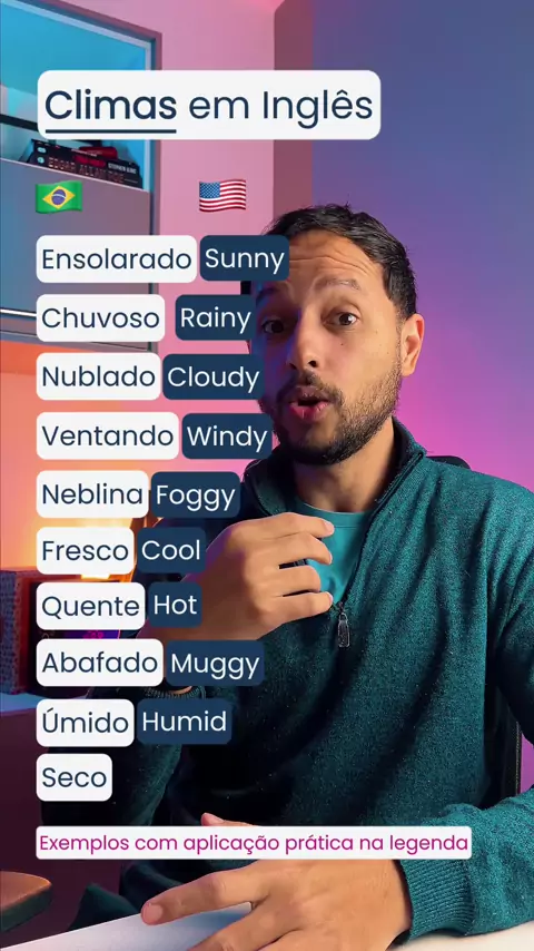 Como falar do tempo em inglês? 🇧🇷 Hoje o dia está chuvoso. 🇺🇸 Today is a rainy day. 🇧🇷 Amanhã vai estar ensolarado. 🇺🇸 Tomorrow will be sunny. 🇧🇷 O céu está nublado agora. 🇺🇸 The sky is cloudy now. 🇧🇷 Está ventando muito lá fora. 🇺🇸 It’s very windy outside. 🇧🇷 A estrada está difícil por causa do tempo nebuloso. 🇺🇸 The road is hard because it’s foggy. 🇧🇷 Está fresco hoje de manhã. 🇺🇸 It’s cool this morning. 🇧🇷 Gosto de dias quentes para ir à praia. 🇺🇸 I like hot