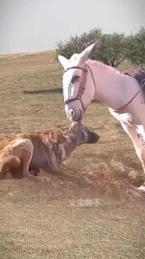 cavalo puxando a orelha do cachorro