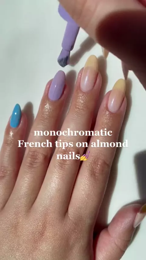 how to create monochromatic French tips on almond nails🤍#nails#nailpolish#nailinspo#nailsof#nailart#nailtutorial#diynails#diymanicure#naturalnails#nailsathome#monochromatic#frenchtips