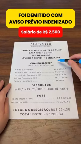 Demitido com aviso prévio indenizado e salário de R$ 2.500. Quanto recebe? Trabalhou de 18/04/2023 a 20/03/2025 e foi dispensado sem justa causa, com aviso prévio indenizado? Veja uma estimativa do que pode receber na rescisão: ✅ Saldo de salário (dias trabalhados no mês da demissão) ✅ Aviso prévio indenizado ✅ 13º salário proporcional ✅ Férias vencidas + 1/3 ✅ Férias proporcionais + 1/3 ✅ FGTS liberado + 40% de multa ⚠ Atenção: essa é apenas uma estimativa! O valor pode variar conforme o cas
