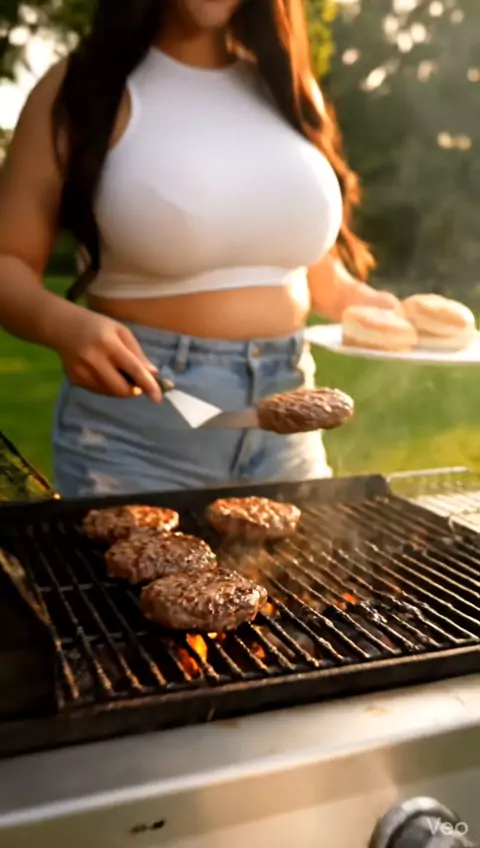 hermosa Coreana haciendo hamburguesas en una tarde de verano