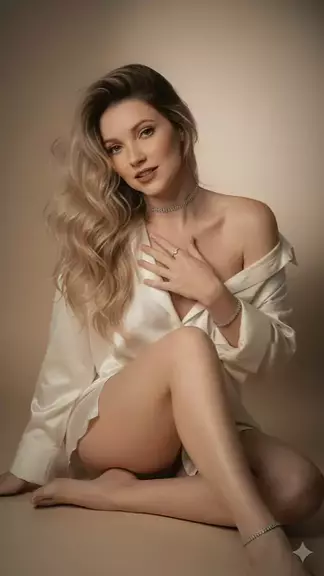 Crie uma imagem da mulher na foto (preservando ao máximo suas características faciais). Um close cinematográfico de uma jovem com cabelos longos e loiros e aparência elegante. Ela veste uma camisa oversized de cetim marfim, desamarrada e aberta no pescoço. A camisa cai sensualmente sobre um ombro, revelando parte do peito e da clavícula. Um delicado conjunto de joias de diamante, incluin