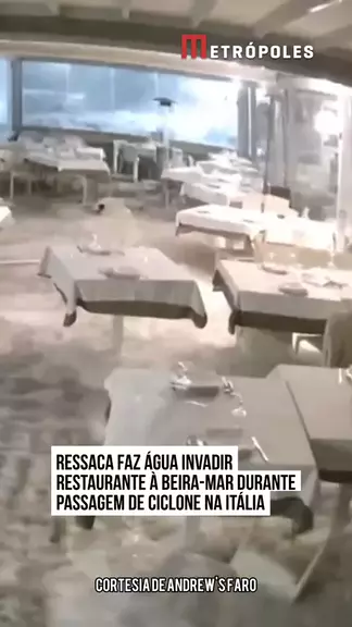 Imagens de câmeras de segurança registraram o momento em que uma onda invadiu e inundou o salão de um restaurante à beira-mar em #Catânia, na #Sicília, nessa terça-feira (20/1), durante a passagem do ciclone Harry pelo sul da #Itália. No vídeo, é possível ver que a onda quebrou os vidros do estabelecimento, arrastando mesa e destruindo louças e o piso. #KwaiNotícias 🤳 Cortesia de Andrew's Faro via Reuters