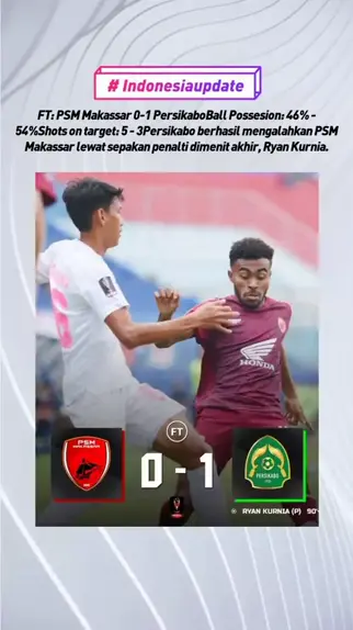 FT: PSM Makassar 0-1 PersikaboBall Possesion: 46% - 54%Shots on target: 5 - 3Persikabo berhasil mengalahkan PSM Makassar lewat sepakan penalti dimenit akhir, Ryan Kurnia.....Supported By:.@KaikoSlot Agen Bola Slot Event Berhadiah 20 Juta #KaikoSlot