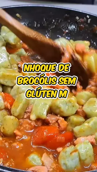 NHOQUE DE BROCÓLIS SEM GLÚTEN COM MOLHO DE LINGUIÇA Ingredientes 250 g de brócolis 1 1/2 xícara de farinha de arroz (210 g) 1 colher de chá de sal (6 g) água quente 1 fio de óleo 1/2 cebola (50 g) 3 dentes de alho (8 g) 3 gomos de linguiça toscana (180 g) 100 g de tomate cereja 200 g de molho de tomate sal a gosto pimenta do reino a gosto manjericão a gosto água a gosto capacidade da xícara é de 240 ml peso é o total dos ingredientes