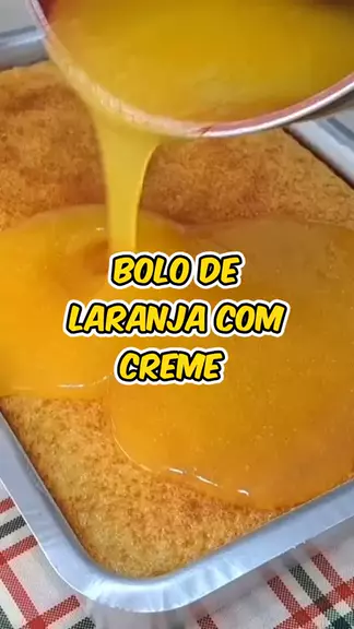 BOLO DE LARANJA COM CREME DA MINHA MÃE Ingredientes: 4 ovos (220 g) 1 1/2 xícaras de açúcar (300 g) 1/2 xícara de óleo (120 ml) 1 xícara de suco de laranja (240 ml) 2 xícaras de farinha de trigo (320 g) 1 colher de sopa de fermento em pó (15 g) 1 1/2 xícaras de suco de laranja (360 ml) 1/2 xícara de açúcar (100 g) 2 colheres de sopa de amido de milho (20 g) 1/4 xícara de água (60 ml) capacidade da xícara é de 240 ml peso é o total dos ingredientes