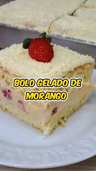 BOLO GELADO DE MORANGO Ingredientes: Massa 4 ovos (220 g) 1 1/2 xíc de açúcar (300 g) 1/4 xíc de óleo (60 ml) 1 xíc de leite morno (240 ml) 2 xíc de farinha de trigo (320 g) 1 pitada de sal 1 col de sopa de fermento em pó (15 g) Recheio 2 cx de leite condensado (790 g) 1 cx creme de leite (200 g) 1 xíc de leite (240 ml) 2 col de amido de milho (20 g) 1/2 xíc de leite ninho (50 g) 1 barra de chocolate branco (80 g) 400 g de morangos picados Cobertura 2 barras de chocolate bc 1/2 cx creme lt