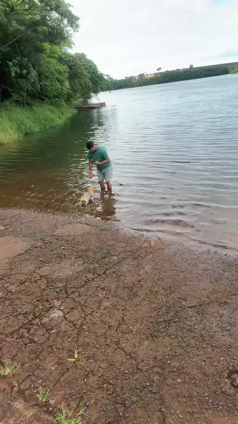 Meu amigo Alan está dando banho no cachorrinho dele no rio.