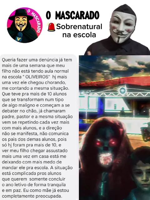 Mascarado aqui… Hoje vou relatar algo que tem causado medo e preocupação em muitas famílias. São relatos sobre algo sobrenatural acontecendo dentro da escola Oliveiros Mendes, em Penalva. Segundo o depoimento de uma mãe, já faz mais de uma semana que seu filho não tem aula normal. Hoje, ele voltou pra casa chorando, mais uma vez contando a mesma história assustadora… Ele disse que mais de dez alunos se transformam, como se fossem tomados por algo maligno. Começam a se debater no chão, gritar,