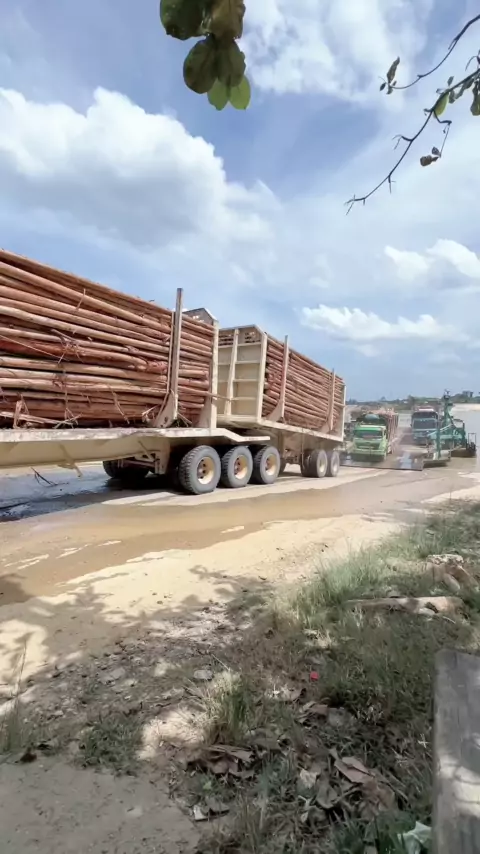 Detik-detik truk bernotase tinggi mengangkut kayu bahan baku pabrik PT RAPP, keluar dari ponton penyebrangan sungai Kampar kecamatan Langgam.