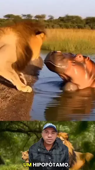 Leão foi tomar água de repente apareceu um hipopótamo