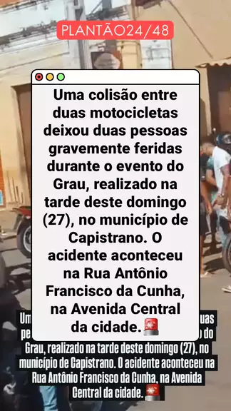 Uma colisão entre duas motocicletas deixou duas pessoas gravemente feridas durante o evento do Grau, realizado na tarde deste domingo (27), no município de Capistrano. O acidente aconteceu na Rua Antônio Francisco da Cunha, na Avenida Central da cidade.🚨 #noticias #noticiasdeultimahora #últimasnotícias #flagrante #ultranoticia