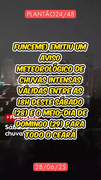 Chove forte na noite deste sábado em Fortaleza. A Fundação Cearense de Meteorologia e Recursos Hídricos (Funceme) emitiu um aviso meteorológico de chuvas intensas válidas entre as 18h deste sábado (28) e o meio-dia de domingo (29) para todo o Ceará. A condição é provocada pela aproximação de um Cavado em superfície — sistema meteorológico que favorece a formação de nuvens e precipitações.* #notícia #alagamento #últimasnotícias #ceara3xmaisforte #chuva