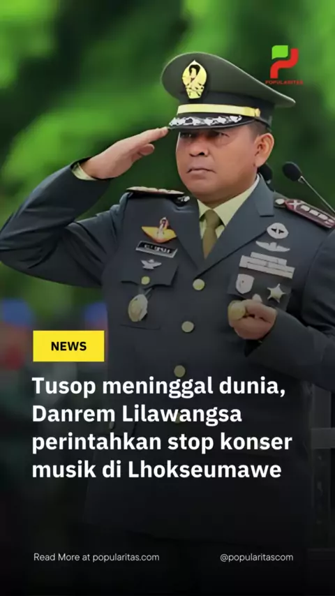 Tusop meninggal dunia, Danrem Lilawangsa perintahkan stop konser musik di Lhokseumawe. POPULARITAS.COM - Danrem 011/Lilawangsa Kolonel Inf Ali Imran, perintahkan panitia konser musik yang direncanakan di Lhokseumawe untuk membatalkan acara tersebut. Seyogyanya, konser musik bertajuk Magnum Motion direncanakan di gelar di Kota Lhokseumawe. Namun, dikarenakan duka tengah menyelimuti rakyat Aceh atas kepergian Tgk Muhammad Yusuf A Wahab (Tusop), Danrem meminta pihak panitia untuk membatalkan renca...