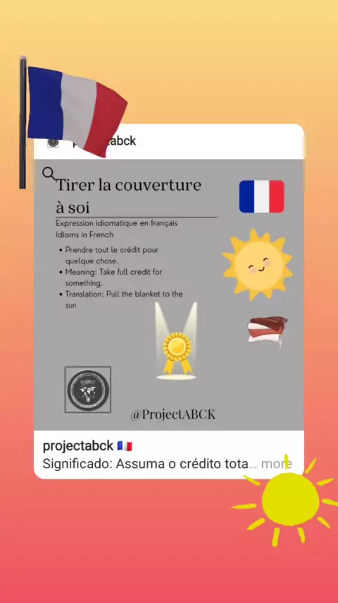 🇫🇷 Significado: Assuma o crédito total por algo. Tradução: Puxe o cobertor para o sol Significado: tomar todo el crédito por algo. Traducción: Tire de la manta al sol المعنى: خذ الائتمان الكامل لشيء ما. ترجمة: اسحب البطانية إلى الشمس Significato: prendi tutto il merito di qualcosa. Traduzione: Tirare la coperta al sole Bedeutung: Nehmen Sie die volle Anerkennung für etwas. Übersetzung: Zieh die Decke der Sonne entgegen #français #french #frances #polyglot #languages