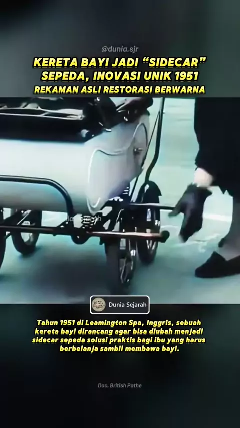 Rekaman tahun 1951 ini menampilkan Pram-Car, sebuah inovasi di Leamington Spa, Warwickshire. Seorang perempuan mengubah kereta bayi menjadi sidecar sepeda hanya dalam hitungan detik. Batang penghubung ditarik dari bawah kereta, sepeda dipasang, dan bayi tetap duduk nyaman dengan pelindung depan dari angin dan hujan. Dirancang oleh Clayton Wright, seorang insinyur perang, Pram-Car terinspirasi dari anak-anak yang dulu sering dibonceng di jok belakang sepeda dan terlihat tidak nyaman. Saat pegang...
