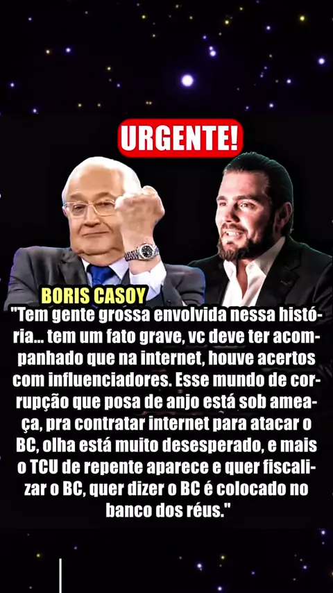🎯 Boris Casoy denuncia corrupção e ataques ao Banco Central: “Tem gente grossa envolvida” O jornalista Boris Casoy fez uma declaração contundente sobre os bastidores da política brasileira, afirmando que há figuras poderosas envolvidas em um esquema de corrupção que inclui acertos com influenciadores para atacar o Banco Central (BC). Segundo ele, o desespero é tão grande que até o TCU apareceu de repente querendo fiscalizar o BC, colocando a instituição no banco dos réus. > “Esse mundo de co