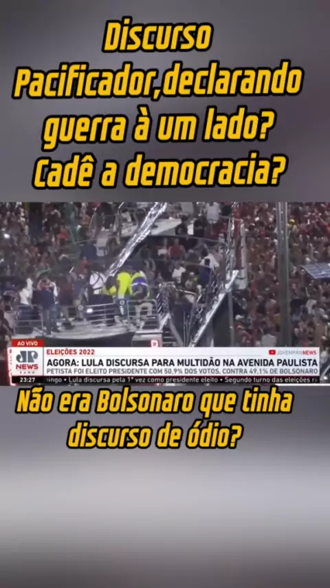 Discurso Pacificador? Esse é o "amor" que venceu? Não é o presidente que tem discurso de ódio? PRATICAMENTE DECLARANDO GUERRA A UM LADO! UM "PRESIDENTE" QUE FALA ABERTAMENTE QUE NAO GOVERNARÁ PARA TODOS,É UM DISCURSO DE ÓDIO,DE GUERRA,DE ATAQUE A DEMOCRACIA SEM PRECEDENTES!! #Brasil #patria #sejacriador #Eleições2022 #foryou