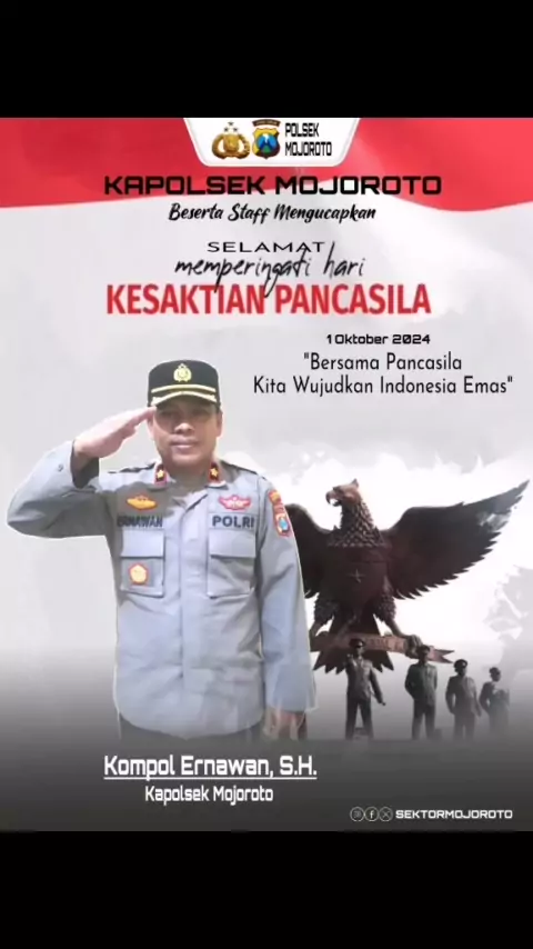 Kapolsek Mojoroto Beserta Staf Mengucapkan Selamat Memperingati Hari Kesaktian Pancasila 1 Oktober 2024 "Bersama Pancasila Kita Wujudkan Indonesia Emas" @divisihumaspolri @HumasPoldaJatim @sektormojoroto #polreskedirikotaSekartaji #polsekmojoroto #jadilahpolisiyangterusmenebarkebaikan