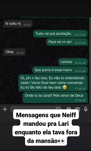 Mensagens que Neiff mandou pra Lari enquanto ela tava fora da mansão...👀 #Treta #casal #neiff #viraliza #KwaiFamilia